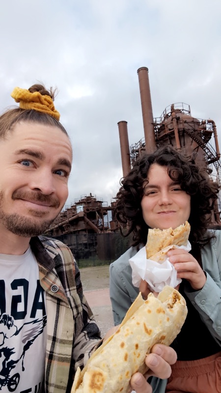 Photo of us at Gas Works Park, enjoying breakfast burritos! We even saw a seaplane land right in front of us on the lake!